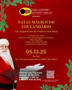 O Educandário Getúlio Vargas realiza, no dia 5 de dezembro, a edição 2025 do tradicional Natal Mágico, evento que reúne atrações culturais e atividades voltadas ao público de todas as idades. A programação começa às 19h, na sede da instituição, localizada na Avenida Coronel Antonino, 1200.