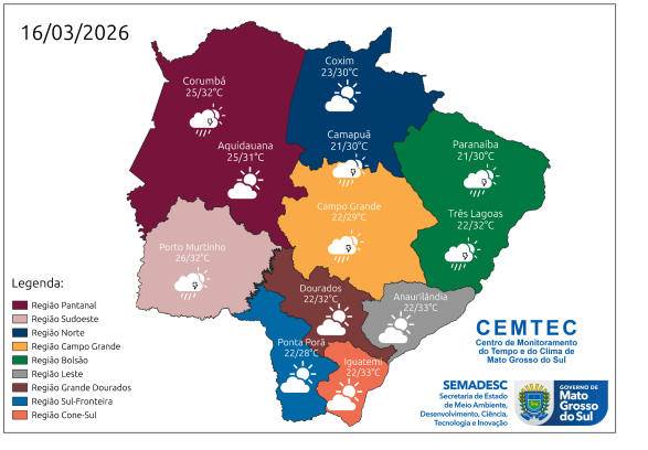 • Campo Grande (Capital): mínimas entre 21°C e 23°C e máximas entre 29°C e 31°C.