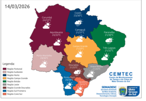 O final de semana em Mato Grosso do Sul será marcado por tempo firme, com predomínio de sol e variação de nebulosidade entre sábado (14) e segunda-feira (16). As temperaturas tendem a se elevar, podendo atingir valores entre 33°C e 36°C, especialmente nas regiões pantaneira, sul e sudoeste do estado.