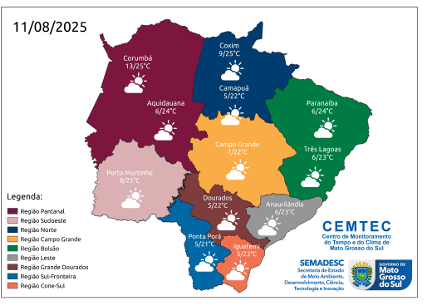 Para esse período, estão previstas mínimas entre 3 °C e 6 °C e máximas entre 15 °C e 23 °C nas regiões Sul, Cone-Sul e Grande Dourados. Nas regiões Sudoeste e Pantaneira, as mínimas devem variar entre 6 °C e 13 °C e as máximas entre 18 °C e 25 °C. Já nas regiões do Bolsão, Leste e Norte, os termômetros devem registrar mínimas entre 5 °C e 11 °C e máximas entre 19 °C e 25 °C. Em Campo Grande, são previstas mínimas entre 5 °C e 8 °C e máximas entre 18 °C e 22 °C.