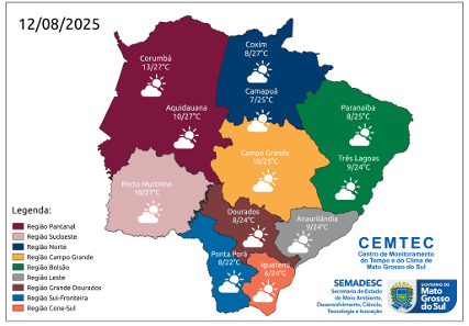 Nas regiões do bolsão, leste e norte, os termômetros devem marcar mínimas entre 4°C e 10°C e máximas entre 23°C e 31°C. Em Campo Grande, a capital, são previstas mínimas entre 5°C e 12°C, com máximas entre 24°C e 28°C.
