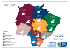 As temperaturas seguem elevadas durante o fim de semana. No sul, Cone-Sul e Grande Dourados, as mínimas variam entre 19°C e 22°C, com máximas de até 32°C. Já nas regiões pantaneira e sudoeste, os termômetros podem chegar a 36°C. No bolsão, norte e leste, as máximas também podem atingir os 36°C, com mínimas entre 20°C e 23°C.
