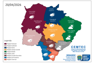 As temperaturas variam conforme a região. No sul, Cone-Sul e Grande Dourados, as mínimas ficam entre 18°C e 20°C, com máximas de 26°C a 30°C. Já nas regiões pantaneira e sudoeste, os termômetros devem marcar entre 22°C e 24°C nas mínimas e alcançar até 34°C nas máximas. No bolsão, norte e leste do estado, as temperaturas variam de 20°C a 22°C nas mínimas e podem chegar a 35°C. Em Campo Grande, a mínima prevista é de 21°C a 23°C, com máxima entre 29°C e 31°C.